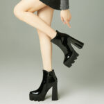 New Brand Women’s Shoes Sexy High Heels Thick Platform Black Blue Genuine Patent Leather Dress Party Working Short Boots